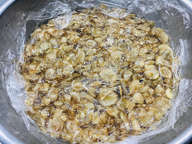 スライスした生姜をハチミツ、砂糖、スパイスでマリネします。