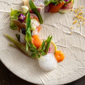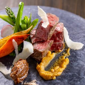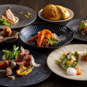 醸す森のダイニングでは、新潟食材を豊富に使用したイタリアンのコース料理をご用意しております。 「ローカルガストロノミー」 ここでしか体験できないAbbinamentを、松之山を知り尽くしたシェフが作り上げます。